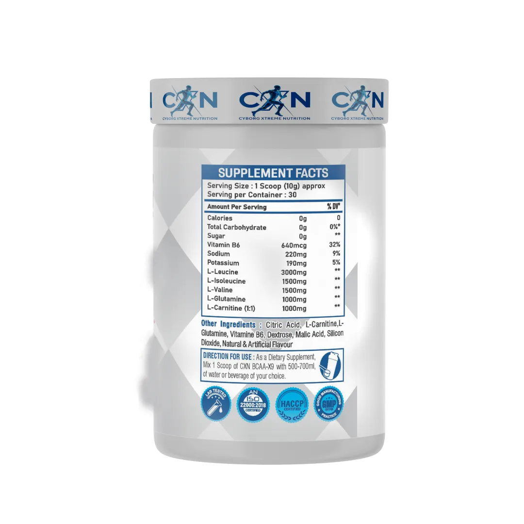 Elevate your training with CXN BCAA-X9 by Cyborg Xtreme Nutrition, a scientifically formulated amino acid blend designed for athletes and serious trainers. The balanced 3:1:1 ratio of BCAAs—enhanced with Glutamine and L-Citrulline—gives you the muscle-building, recovery, and performance benefits you need without the sugar crash.
